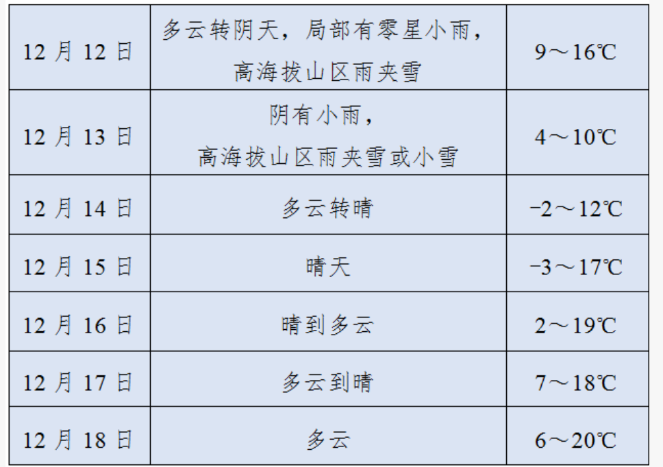 氣溫方面,12月12-13日我市有一次寒潮天氣過程并伴有大風降溫,全市平均氣溫將下降8~10℃,同時平均風力增大到3~4級,陣風7~8級。冷空氣過后,14-15日早晨最低氣溫-4~-2℃,山區-8~-5℃。15日起氣溫逐漸回升。